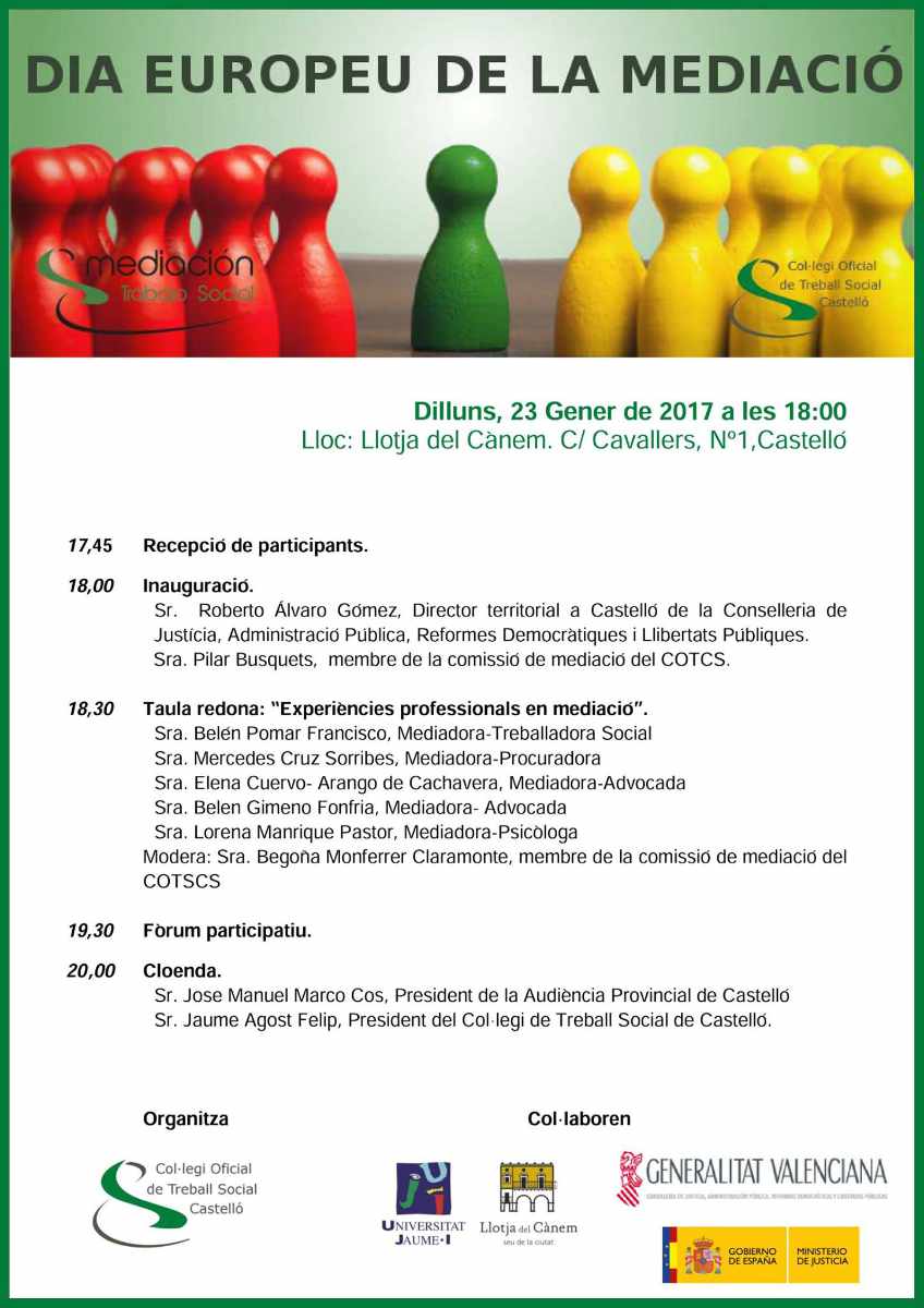 Participación en la mesa redonda «Experiencias profesionales en mediación», con motivo del Día Europeo de la Mediación, organizada por el Colegio Oficial de Trabajo Social de Castellón, enero 2017.